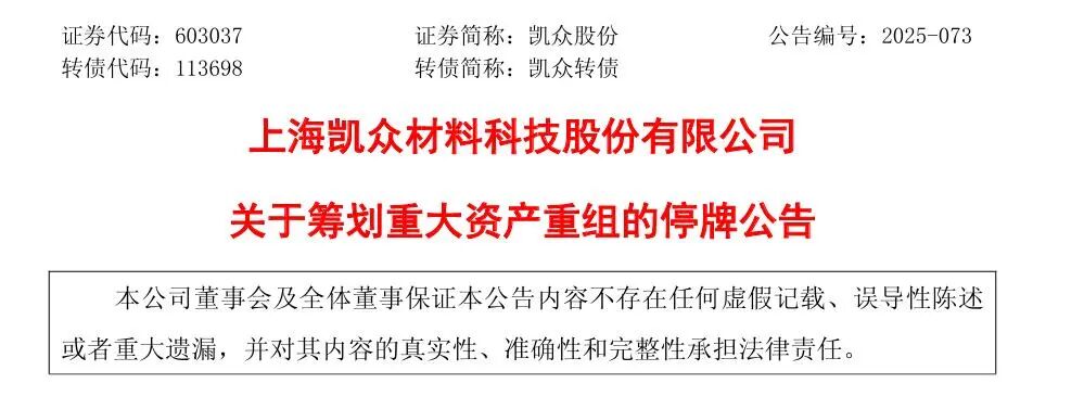 经公司申请,凯众股份自2025年11月24日(星期一)开市起停牌,预计停牌时间不超过5个交易日。待上述事项确定后,公司将及时发布相关公告并申请公司股票复牌。