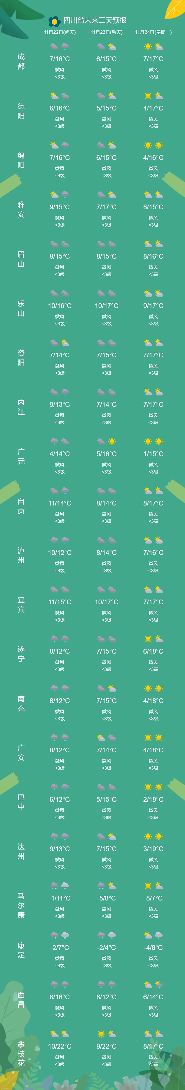 预计明天白天,西部沿山和广元、巴中、达州、南充、广安、泸州、宜宾7市部分地方有小雨或零星小雨,西部高海拔地区有雨夹雪或小雪;