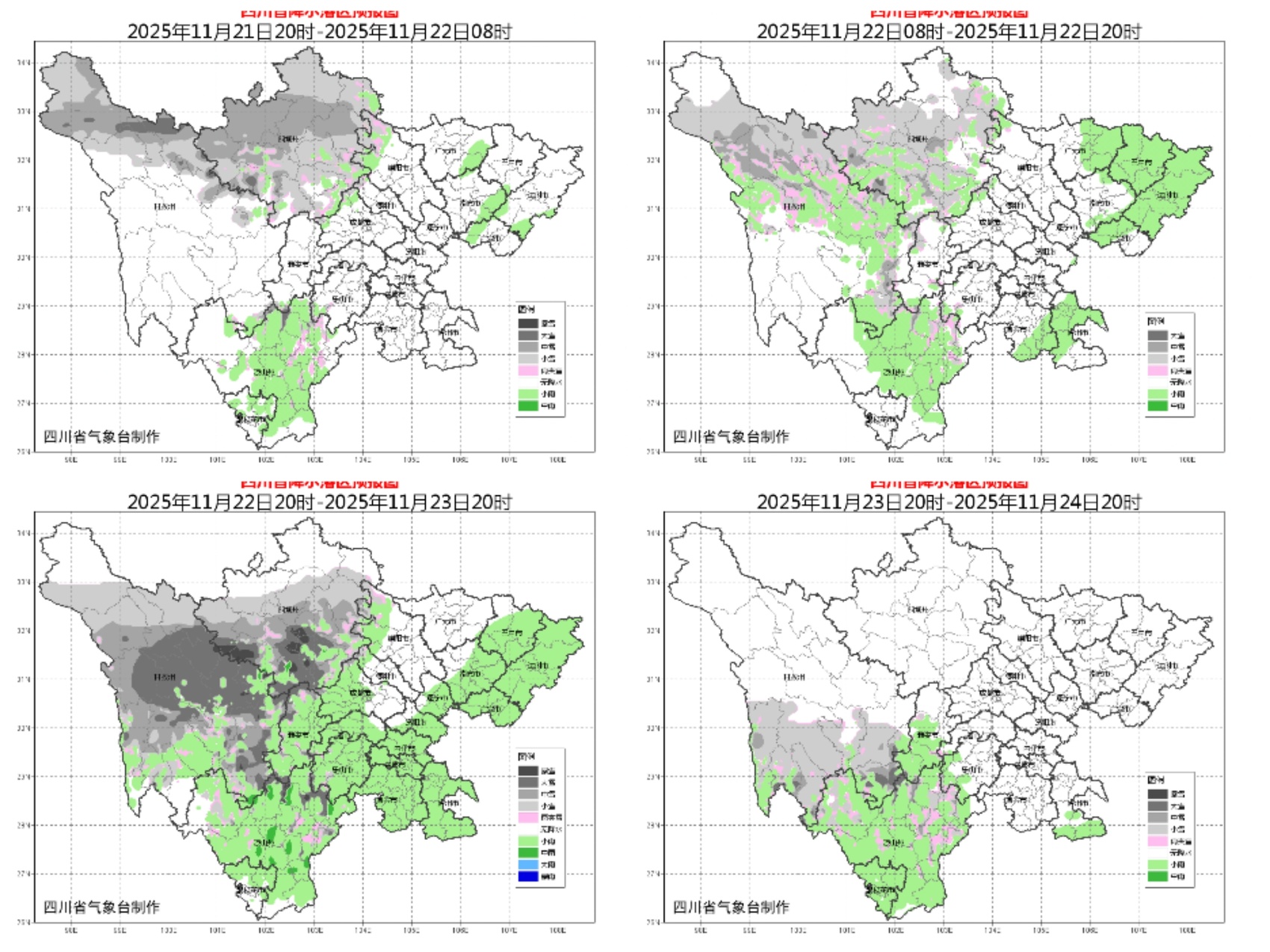 明天(22日)晚上到23日白天,盆地大部阴天有小雨或零星小雨,西部高海拔地区有雨夹雪或小到中雪。