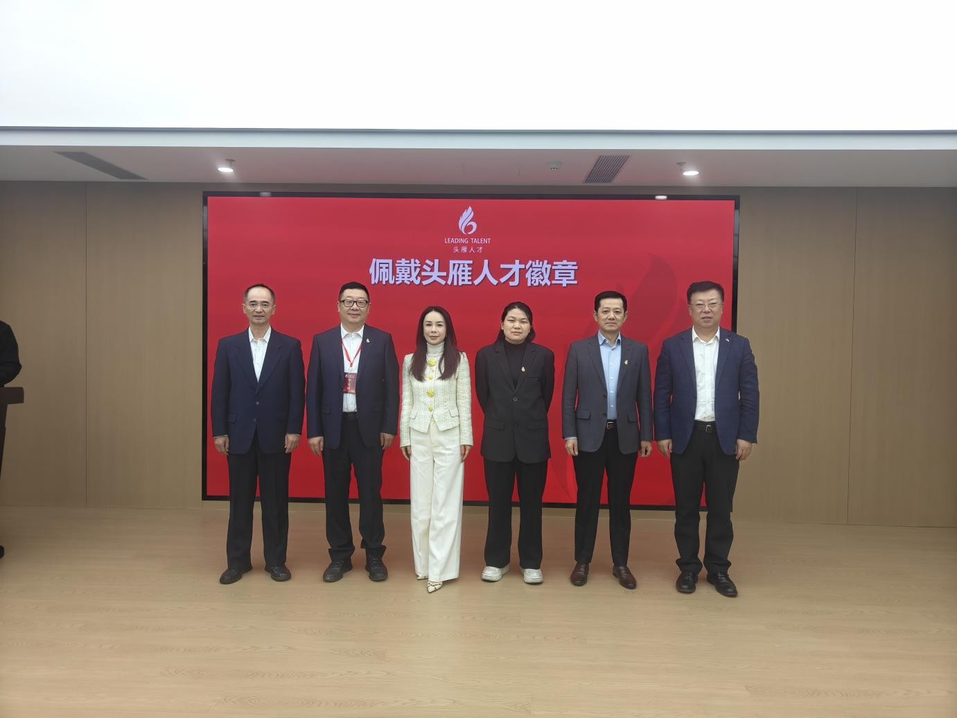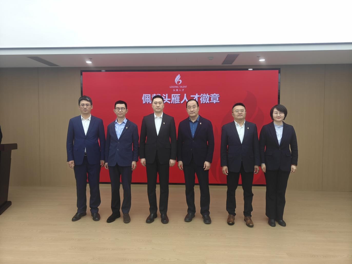 汽车行业领导力研修班企业成长关爱导师中国汽车工业协会副秘书长陈旭、职业技术分会秘书长温良与辅导员工业和信息化部人才交流中心产才融合办公室副主任张真、人才服务处经营管理人才部副主任陆书涛分别为学员代表佩戴上头雁人才徽章。徽章以齿轮和大雁为设计元素,象征“一个齿轮带动一个产业,一群头雁引领一个时代”。