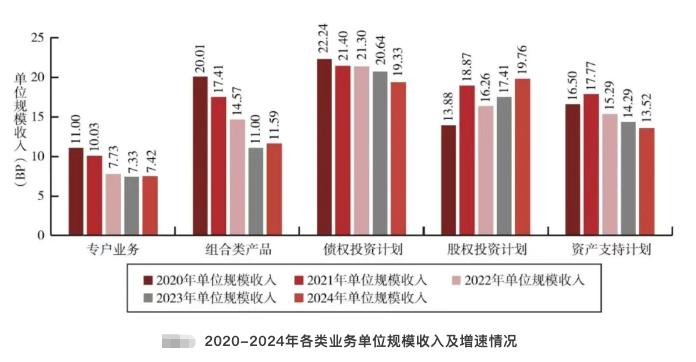 从各业务板块看,2024年,除债权投资计划外,保险资管行业各主要业务收入均有增长。其中,专户业务收入增速连续三年上升,组合类产品业务收入增速连续三年放缓,股权投资计划、资产支持计划业务收入增速较上年有所下降。
