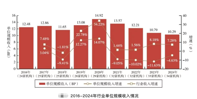 2024年,34家保险资管机构实现收入合计318.30亿元,同比增速7.31%;其中,有同比数据的33家公司收入增速为6.75%。2016—2024年,行业收入复合年均增长率(CAGR)为8.48%。