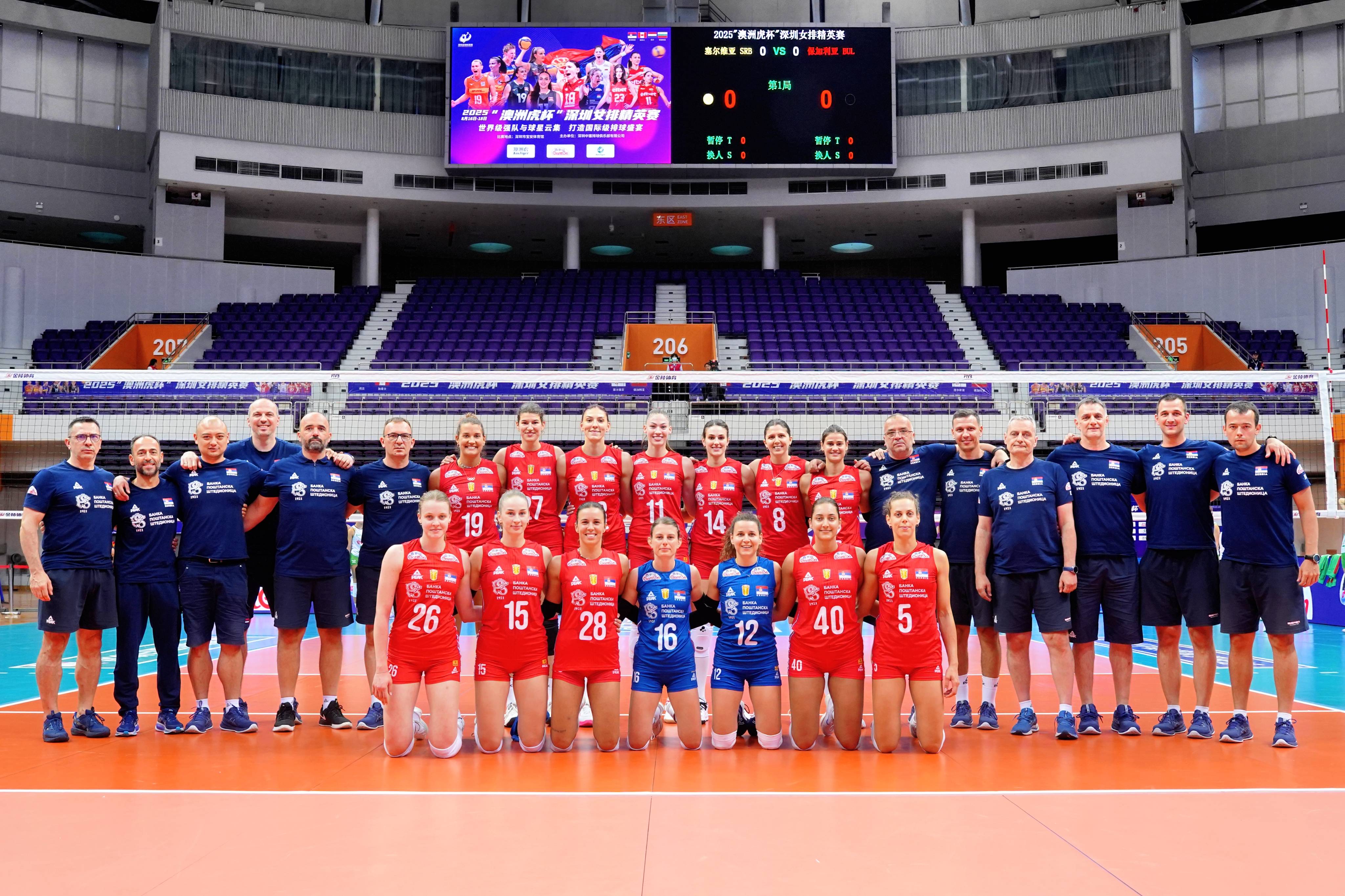 图为世锦赛冠军塞尔维亚女排在深圳宝安体育馆参赛留影