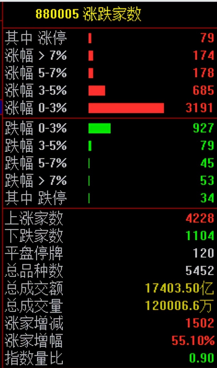 市场共4228只个股上涨,79只个股涨停,1104只个股下跌。