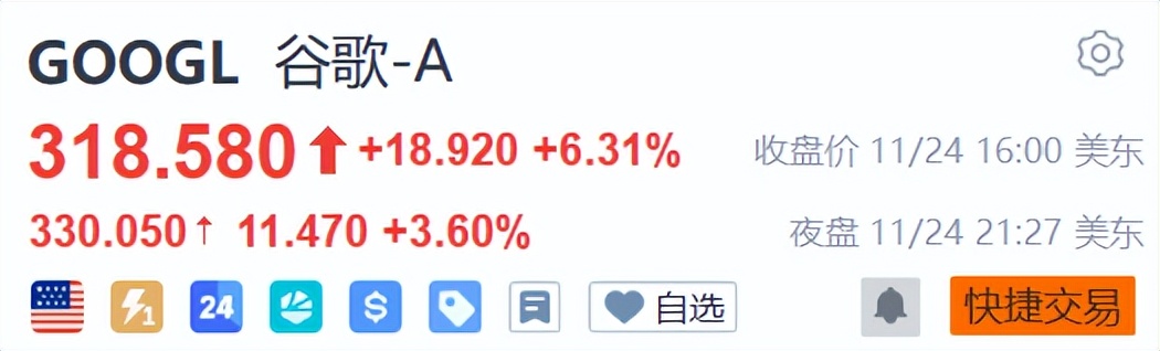 受此消息影响,谷歌美股周一收盘大涨6.31%,继续刷新年度强势行情。