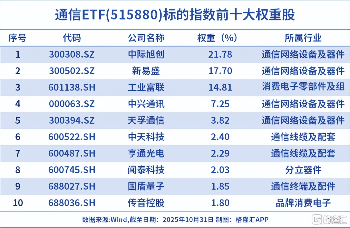 通信ETF(515880)所跟踪的通信设备指数中,“光模块+服务器+铜连接+光纤”合计权重占比超过81%,其中光模块独占52%,服务器占比达22%;在前十大重仓股中,“易中天”(新易盛、中际旭创、天孚通信)合计占比超过43%。