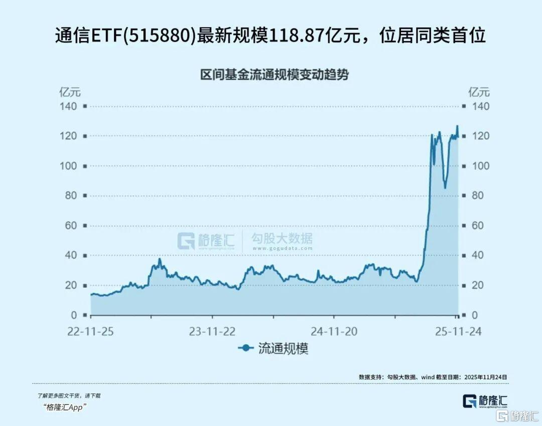 资金也在持续净流入。Wind数据显示,截至11月24日,通信ETF(515880)本月净流入15.01亿元,年内净流入达76.88亿元,最新规模为118.87亿元,规模位居同类首位,年内规模增幅超过380%。