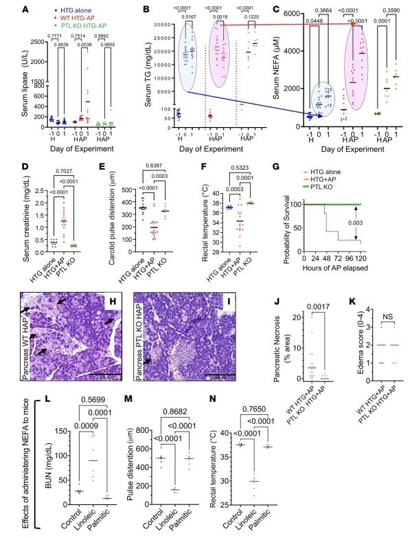 动物实验中,WT小鼠HTG-AP组出现血清NEFA骤升、多器官衰竭(肾损伤、低体温、低血压),3天存活率下降80%,胰腺坏死率达4.7%;而PTL-KO小鼠或奥利司他干预后,上述损伤均被显著抑制(胰腺坏死率降至0.6%,P<0.01)。大鼠输注PPL+GTO后,NEFA升高、氧饱和度下降、肺损伤显著,奥利司他可完全阻断该效应;单独输注饱和NEFA(棕榈酸)无明显器官损伤,而不饱和NEFA(亚油酸)可诱导小鼠重症表现。