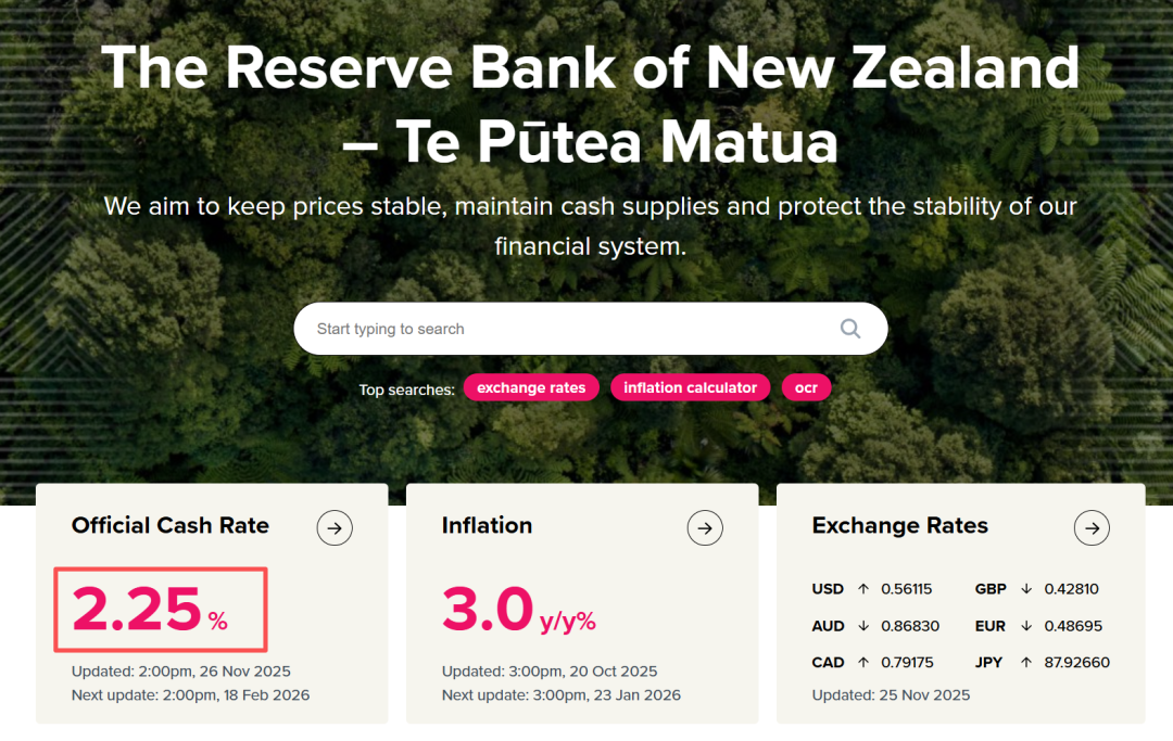 新西兰的降息步伐仍在继续。11月26日,新西兰联储宣布将官方现金利率(OCR)下调25个基点至2.25%。