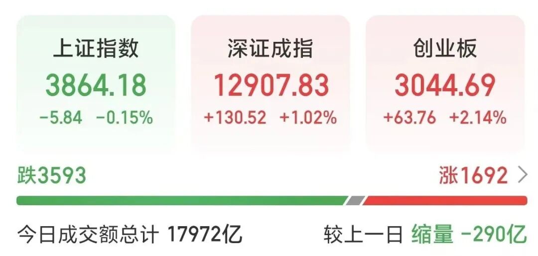 今日午后,A股三大指数走势分化。截至收盘,上证指数跌0.15%,深证成指涨1.02%,创业板指涨2.14%。市场全天成交额超1.79万亿元。