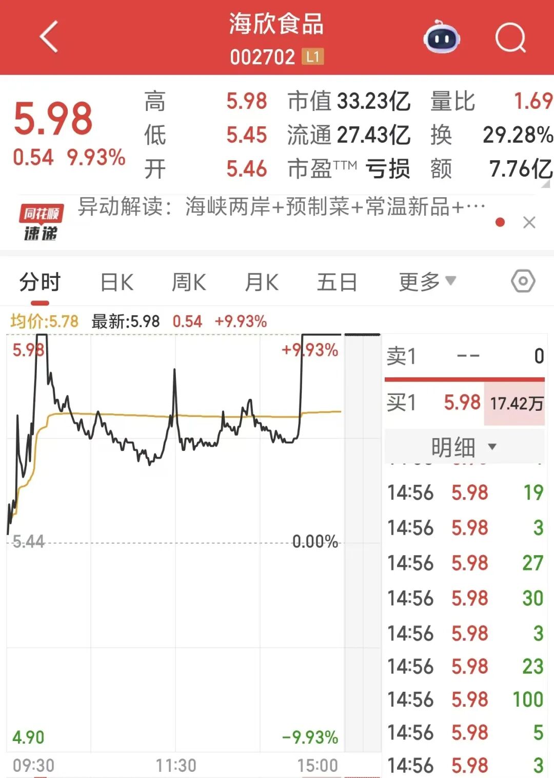 今日午后,大消费板块尾盘异动拉升。海欣食品直线上涨回封涨停,截至收盘,封单超17万手;广百股份、国光连锁等多股涨停。