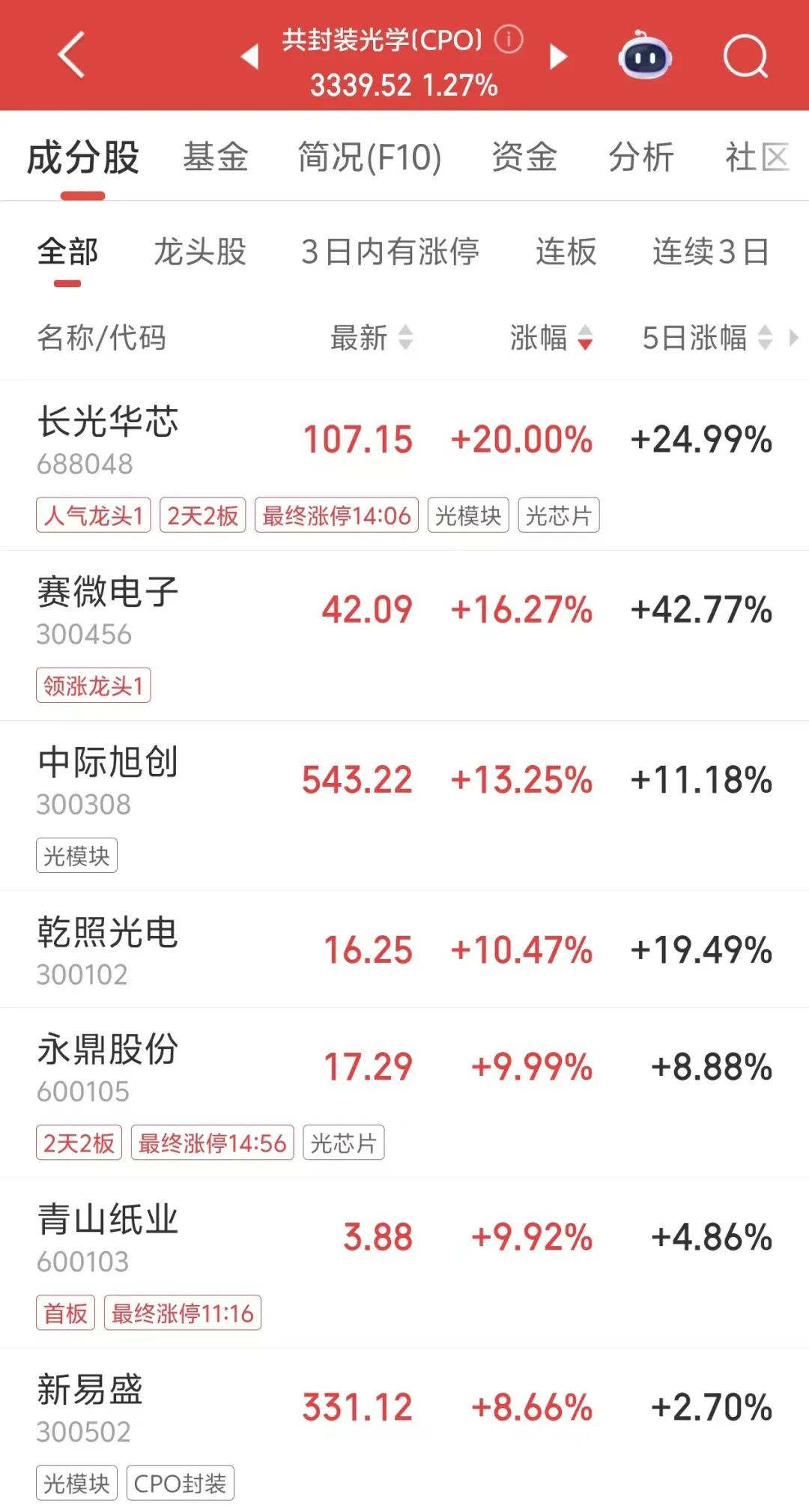 今日午后,CPO概念股持续走强。长光华芯“20CM”涨停,赛微电子涨超16%;永鼎股份下午开盘后秒涨停,13:49开始高位震荡,盘中多次打开涨停板,尾盘封涨停。