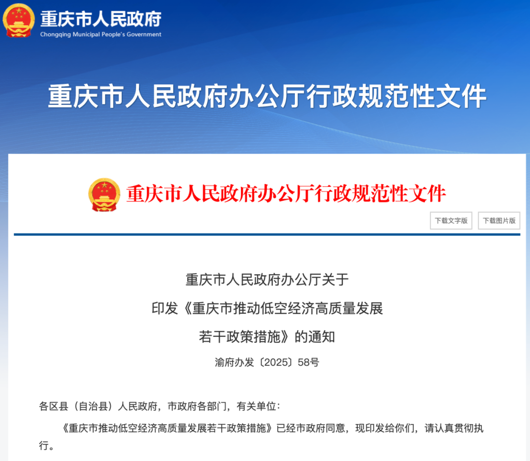 日前,重庆市人民政府办公厅印发《重庆市推动低空经济高质量发展若干政策措施》(以下简称《政策措施》),从三个方面提出了17条具体举措推动低空经济高质量发展。
