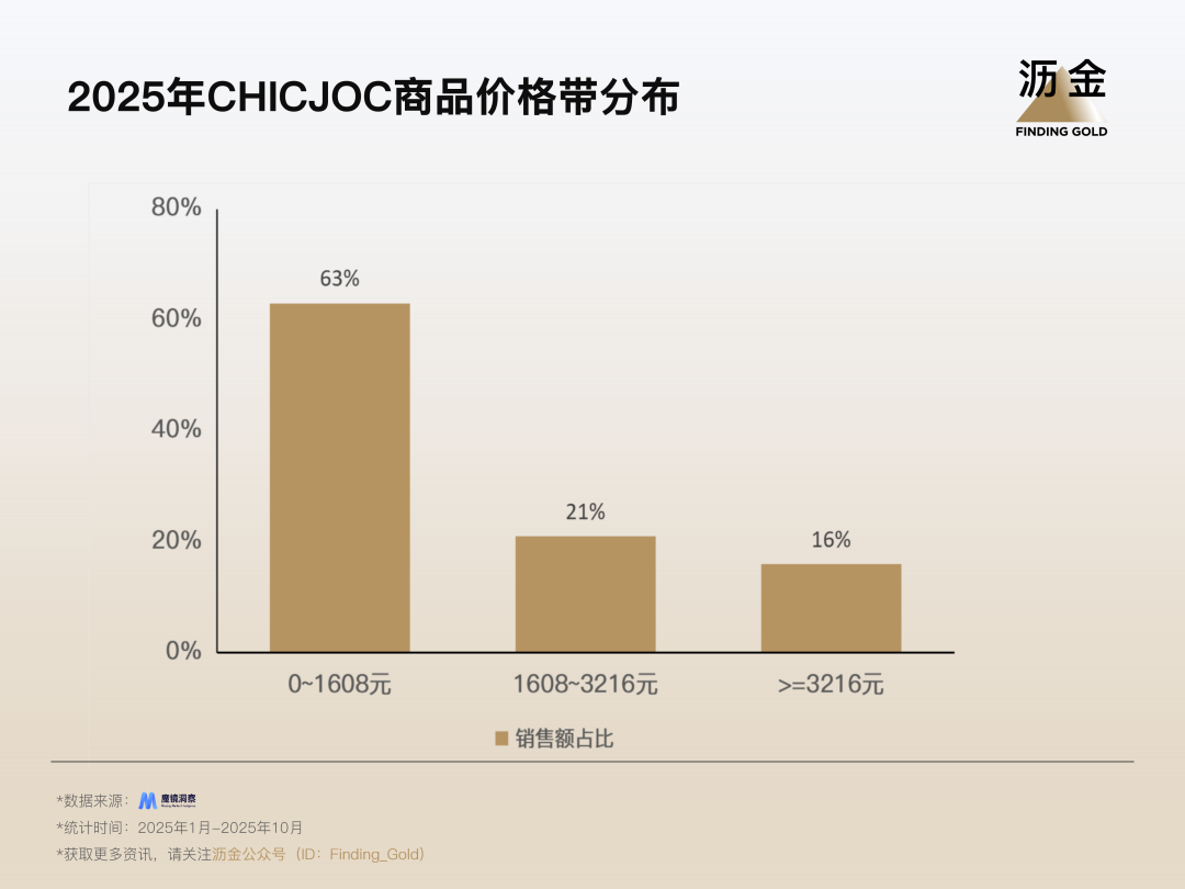CHICJOC的价格结构正说明了这一点:0–1608元区间占比约63%,是“日常稳定需求”组成的底盘;1608–3216元区间占比21%,构成品牌最稳健的现金流来源;≥3216元区间占16%,不仅没有受到消费下行冲击,反而是GMV的拉动力。