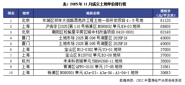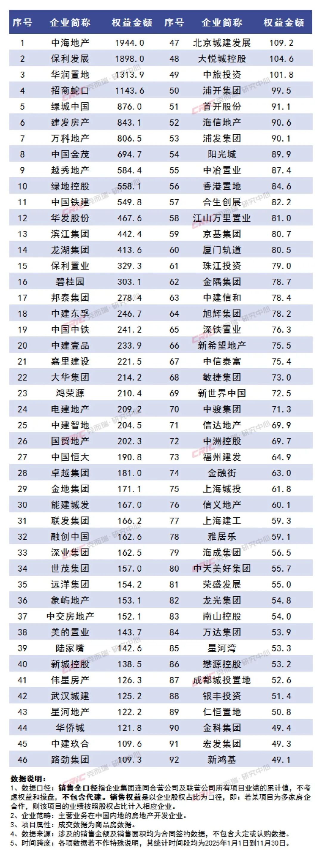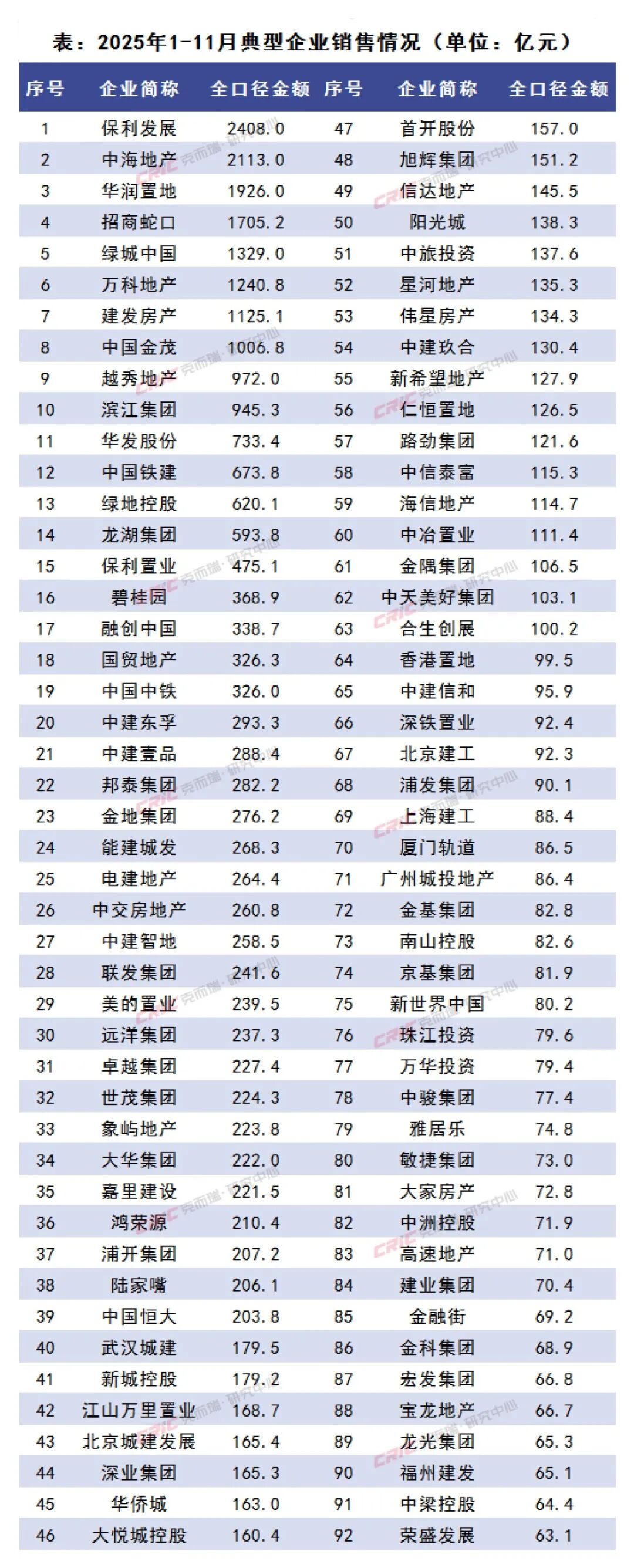 从企业表现来看,2025年11月有38家房企单月业绩环比增长,其中15家企业单月业绩环比增幅大于30%,包括华润置地、中建东孚、北京城建和大悦城等,TOP10房企中有中海地产、华润置地、绿城中国和滨江集团4家的销售全口径金额环比有所增长。