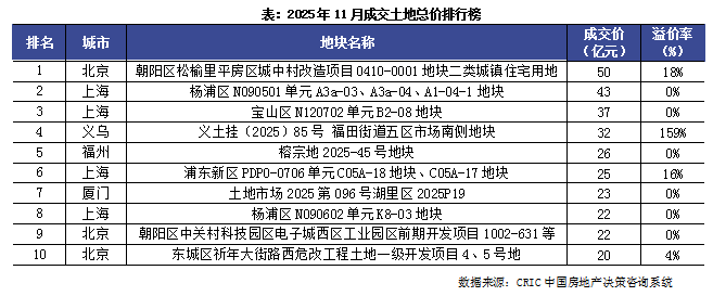 截至11月24日,全国商住办类招拍挂成交建筑面积8604万平方米,其中一线城市上升36%。成交金额方面,一线城市同比上升43%。从市场热度来看,本月溢价率稍有回升,但土拍热度仍集中在少数优质地块,如北京朝阳南磨房、上海浦东川沙等,此外义乌也出现了超高溢价率的优质商办地块。