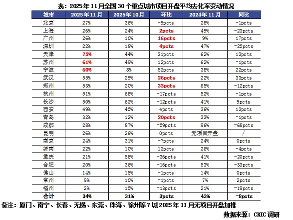 从项目去化率来看,11月市场热度持稳,据CRIC监测数据,30个重点城市11月平均开盘去化率为34%,环比微增3pcts。厦门、南宁、长春、无锡、东莞、珠海、徐州等7城2025年11月无项目开盘加推。分城市来看,去化率超6成城市为仅天津、苏州、宁波,主要得益于个别网红盘集中入市对去化率拉升作用比较显著。从变化趋势看,上海、广州、深圳等热点城市去化率稳步修复,环比持增;武汉、郑州、青岛等前期低迷型城市也出现了止跌态势,环比增幅显著。