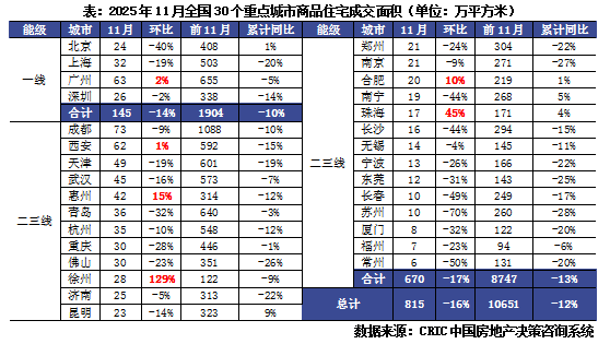 智通财经APP获悉,克而瑞地产研究发布《2025年11月中国房地产市场分析月报》。数据显示,11月,房企推盘积极性小幅回升,30个重点城市11月预期新增供应669万平方米,环比增长16%。一线城市中广州阶段性放量,环比翻番。4个一线城市整体预计供应面积149万平方米,环比增长23%。其中广州单月供应规模达到了61万平方米,因上月基数较低,环比翻番,同比增幅也达到了4%。二三线城市环比增长14%,主要得益于西安、苏州、东莞、常州等城市集中放量。
