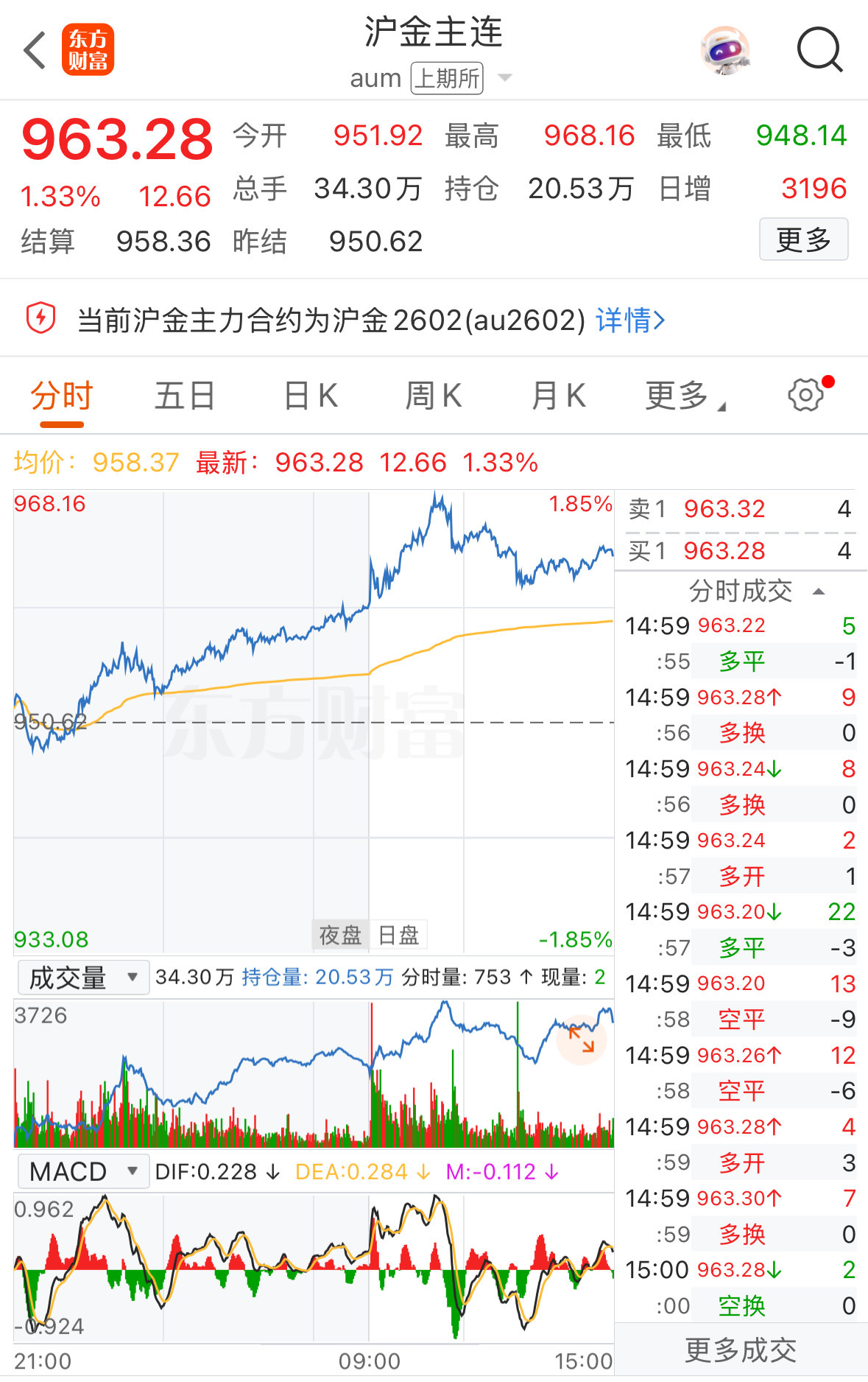 贵金属板块同步上演“狂飙”行情,国际市场上伦敦银现盘中最高触及57.84美元/盎司,刷新历史峰值;伦敦金盘中报4256.33美元/盎司,逼近前期高点。国内市场紧跟节奏,沪金主连合约强势回归960元整数关口,最高价达968.16元/克;贵金属板块内多股纷纷上涨。