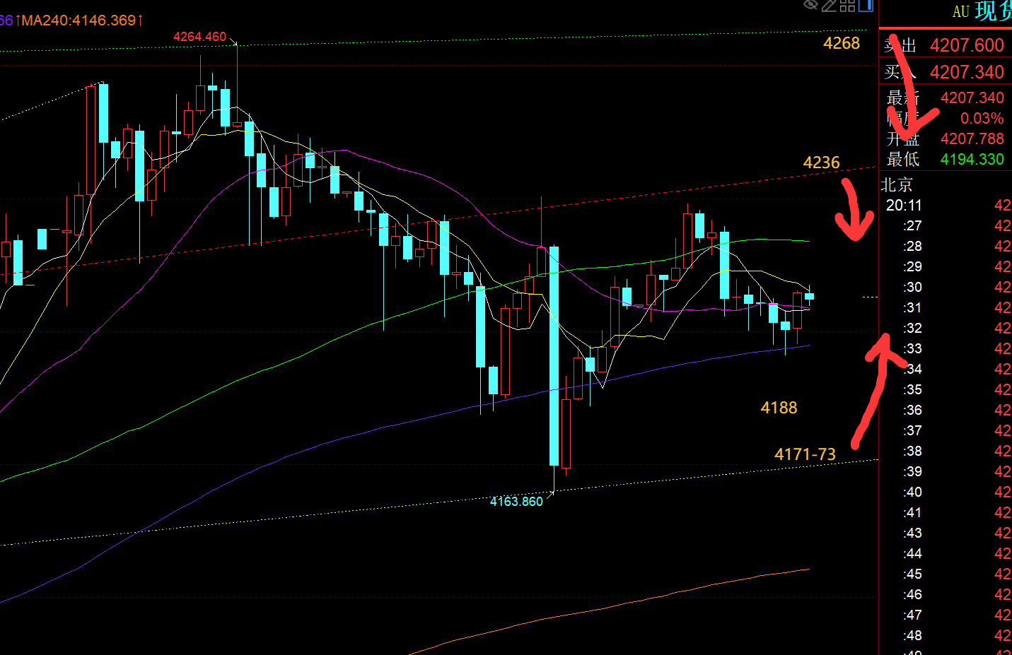 第一,黄金方面:昨日把握节奏相对差,早间先急跌后拉升出长下影K,午后反弹提示留意前期红色通道上轨反压点4225一线承压看压制回落,14点收了不错的饱满阳K,就多考虑了些因素,未及时执行计划而踏空一波;15点二次下探仍稳住4200上趋势通道下轨支撑,认为黄金可能存在4小时向上的一个诱多反抽再进行打压砸盘,因而4210上尝试先震荡看涨,计划4240下再看跌回落,结果欧盘直接慢跌向下失守4200关口;而欧盘弱,美盘则一般还有二次打压,依托4210短期下滑通道上轨,也是欧盘跌幅的618分割处看压制,结果市场先向上惯性多诱多了些距离,最终仍是承压红色通道上轨反压点4230才来砸盘下跌,最低4163,也是382分割位置;可以说,昨日从一开始的犹豫不上,就逐步踩进了市场所挖的坑,进行多空洗盘;慢一拍或快一拍都不行,要刚好踏准节奏,才能完美多空都可以抓,比如上周操作;
