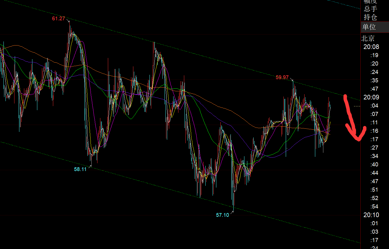 原油方面: 一个多月运行于震荡下滑通道,非常有规律节奏,今晚依托上轨59.7下仍看跌,下轨支撑目标56.5-56,触及再反手看涨;但务必做好风控,这个规律,这个通道不可能一直持续下去,总有一刻会突破;