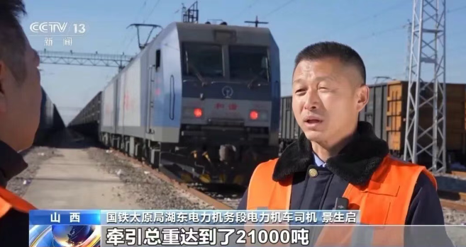 国铁太原局湖东电力机务段电力机车司机 景生启:以一列重载列车为例,牵引总重达到了21000吨,牵引辆数达到了210节车辆、列车的总长度是2611米,真正实现了大重量、长编组运行。