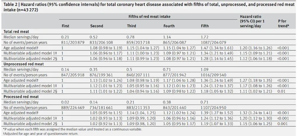 此外,另一项针对美国男性的前瞻性队列研究也发现,红肉摄入量的增加与冠心病风险呈正相关,研究通过长期随访美国男性健康专业人士,结果发现每天增加一份红肉的摄入量,冠心病风险增加了12%(表1)。