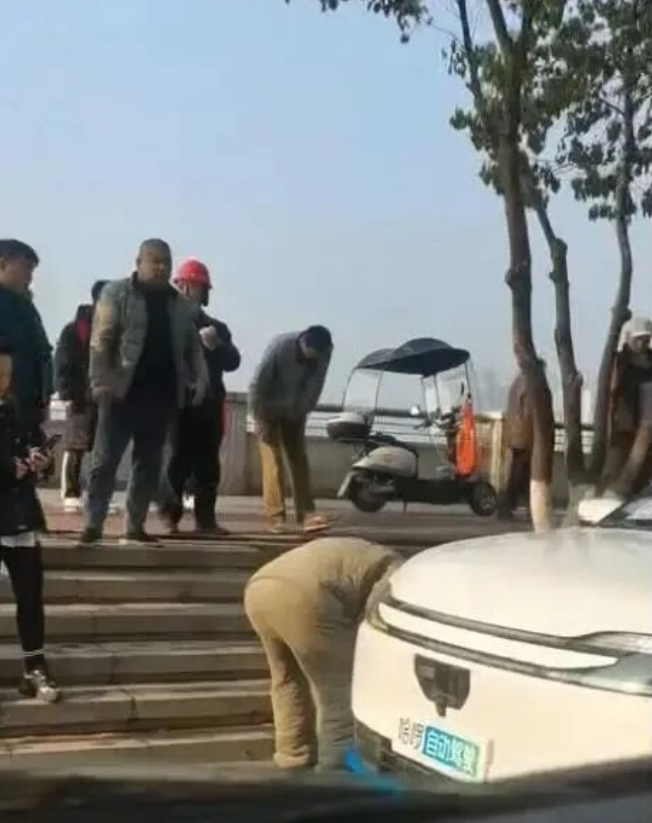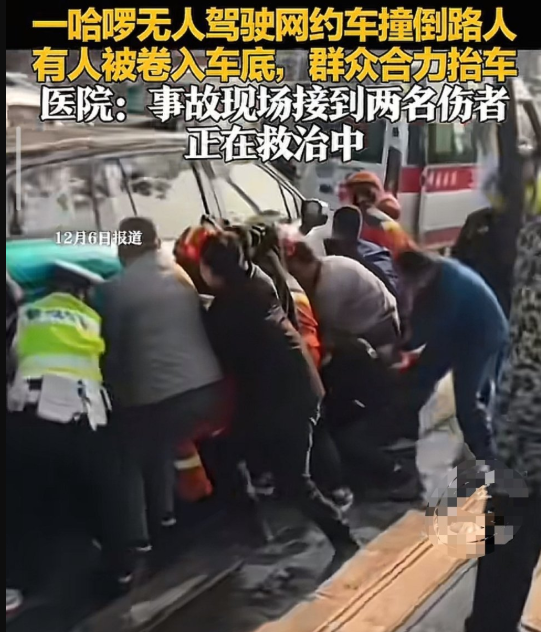 路边的市民合力抬起一辆印着哈啰标志的白色车辆,救助车轮下一位伤者,再次引发公众对于自动驾驶安全性和责任关注。