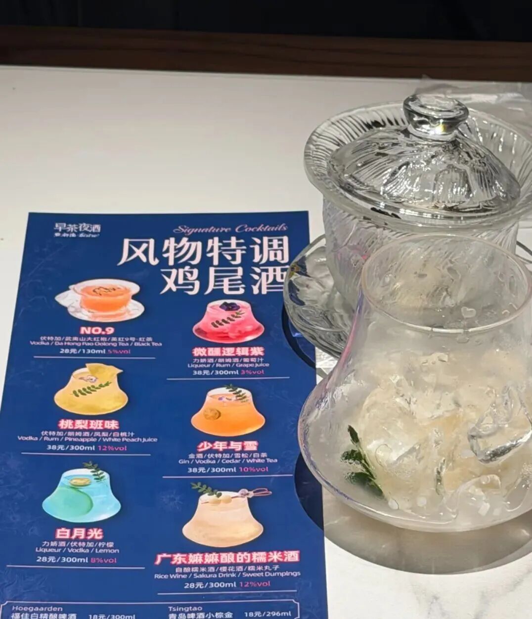 菜单中还全新推出6款特调鸡尾酒,像是“桃梨班味”“少年与雪”“广东嫲嫲酿的糯米酒”,打造低度数、易入口的微醺饮品,单杯定价为28元、38元一杯。