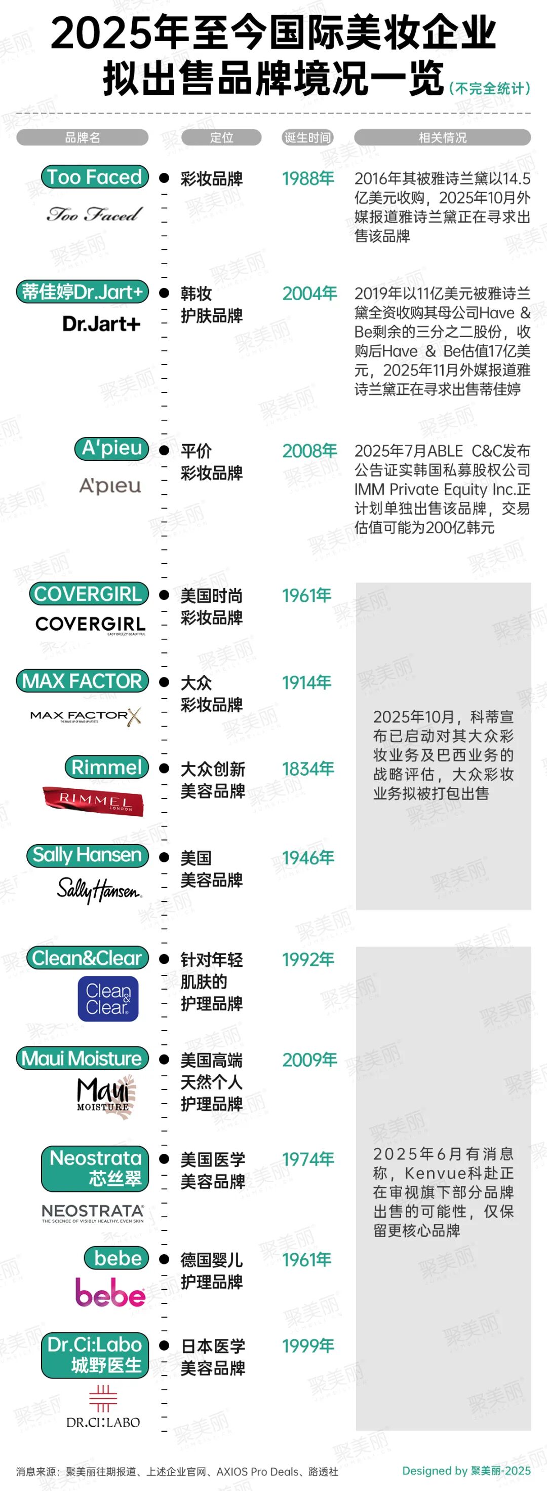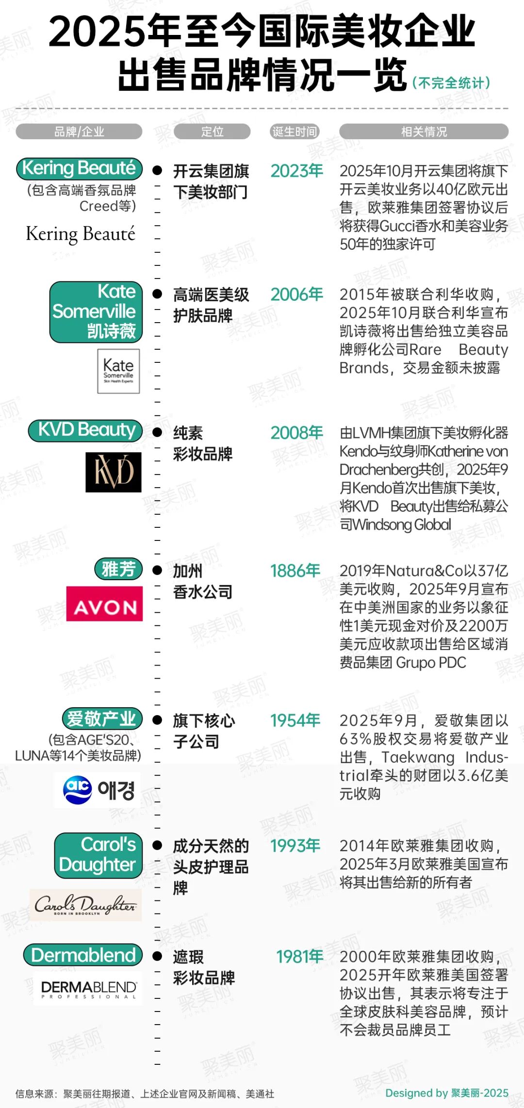 信息来源:聚美丽往期报道、上述企业官网、财报、新闻稿、美通社、北京商报、DT商业观察、麦哥聊美妆、快消八谈、时尚芭莎、小红书、AXIOS Pro Deals、cosmeticsbusiness、asvoriabeaute、beautyindependent