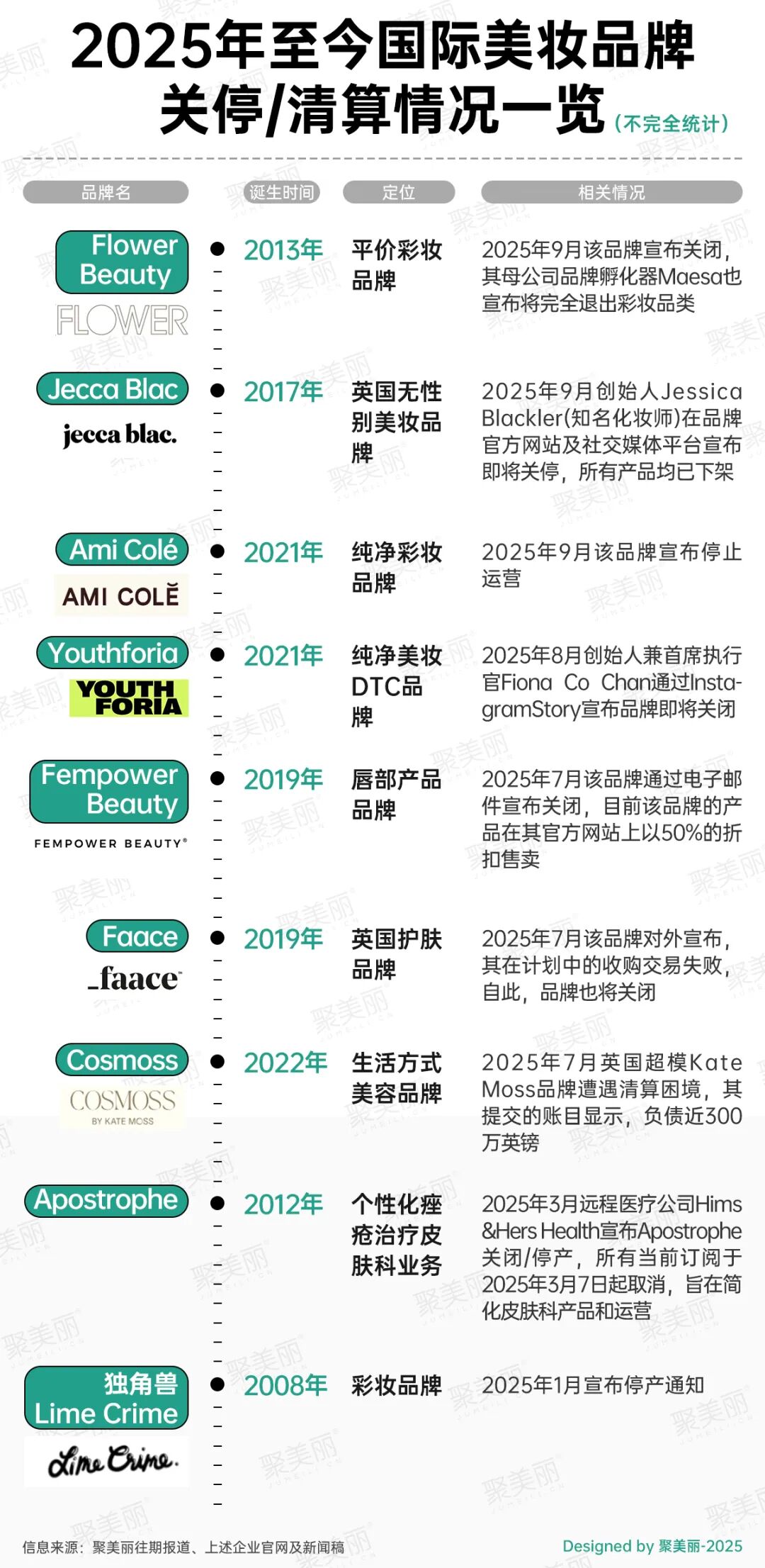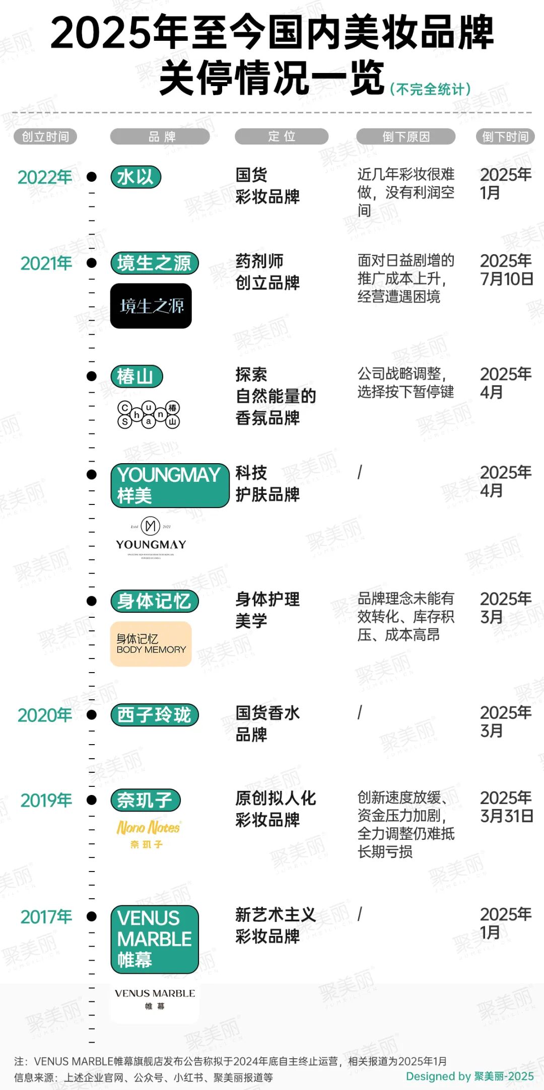 视角聚焦今年国内美妆品牌沦为“弃子”的境况,据聚美丽不完全统计,2025年至今,国内美妆品牌关停的有8个,其中多为新锐品牌。