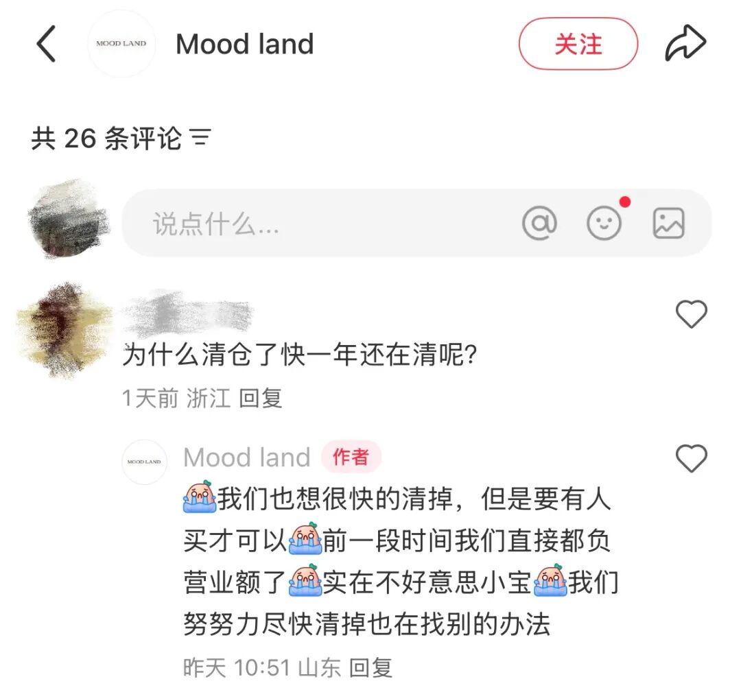 “我们也想很快的清掉,但是要有人买才可以,前一段时间我们直接都负营业额了。”“运营上没啥经验,慢慢就撑不下去了,这次清仓没有任何套路,不会先涨价再打折。”Mood land花言几木如是回复道。