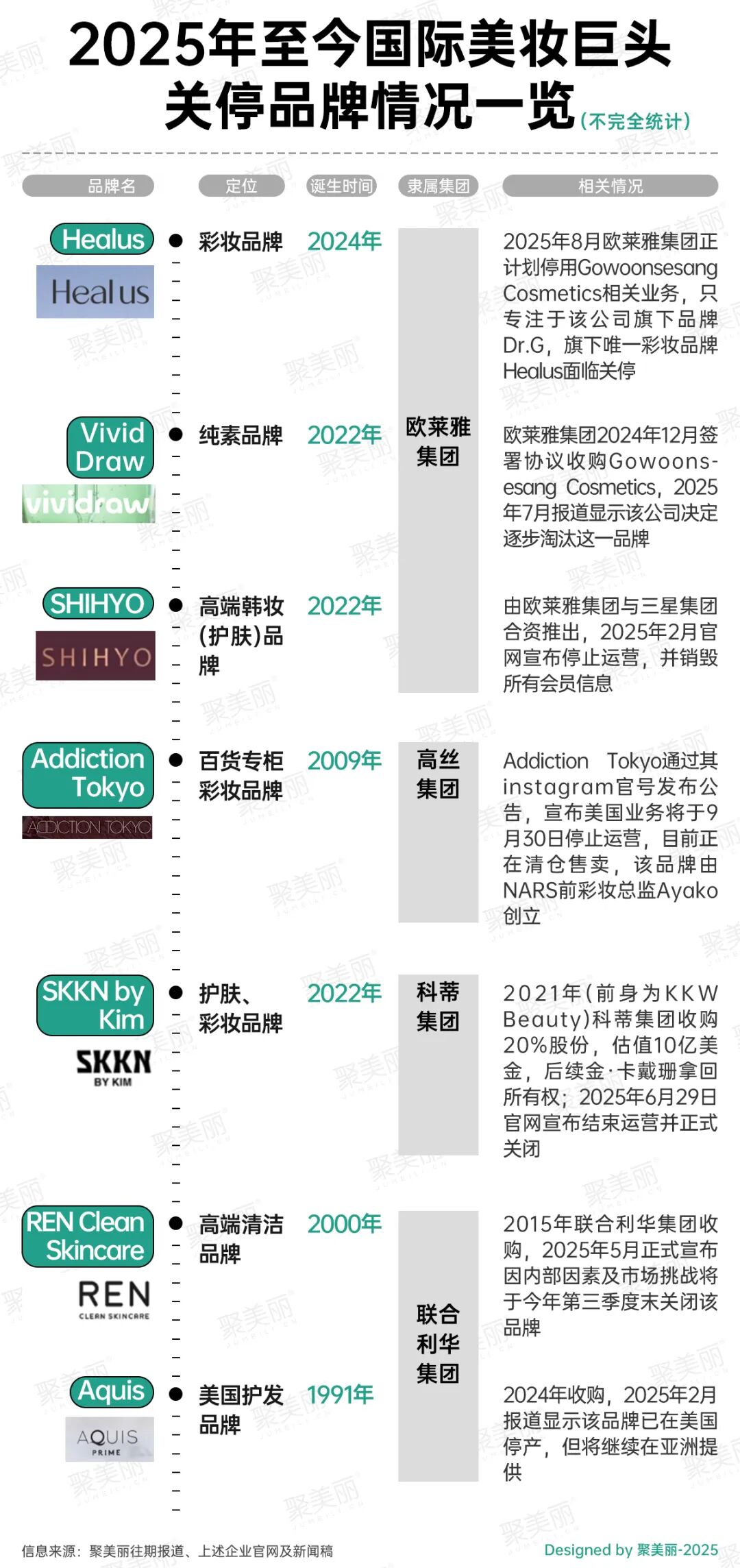 除上文提及的国际美妆巨头关停旗下品牌境况,聚美丽还梳理了2025年至今关停的国际美妆品牌,其中不乏名人美妆,如NARS前彩妆总监Ayako创立的Addiction Tokyo、金·卡戴珊创立的SKKN by Kim,关于此类情况,聚美丽在《估值超10亿美金却难逃倒闭!名人美妆们怎么了?》一文中有过分析,不再赘述。