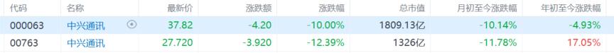 此外,中兴通讯在港上市的认购证“中兴法巴六五购A”一度暴跌超38%。
