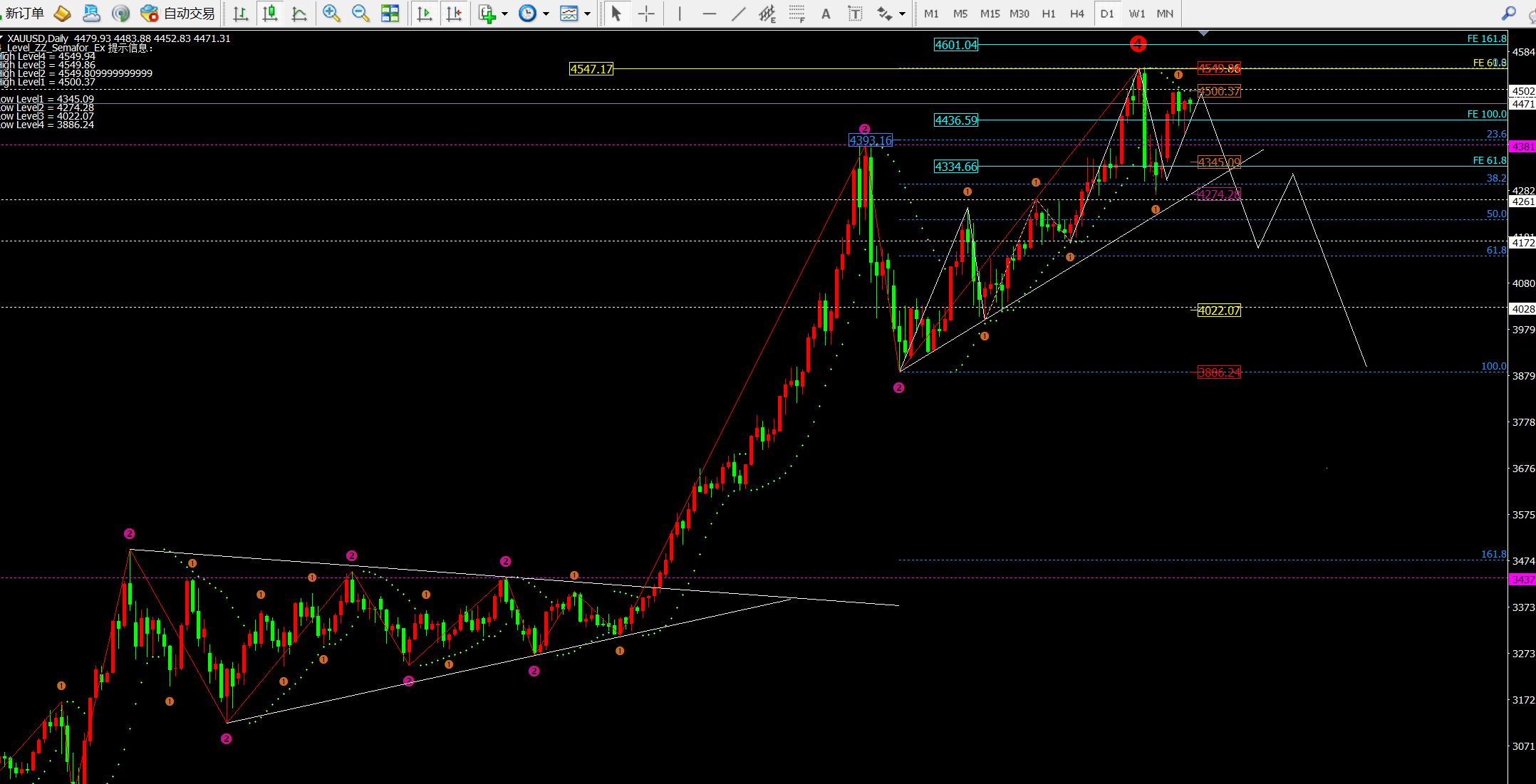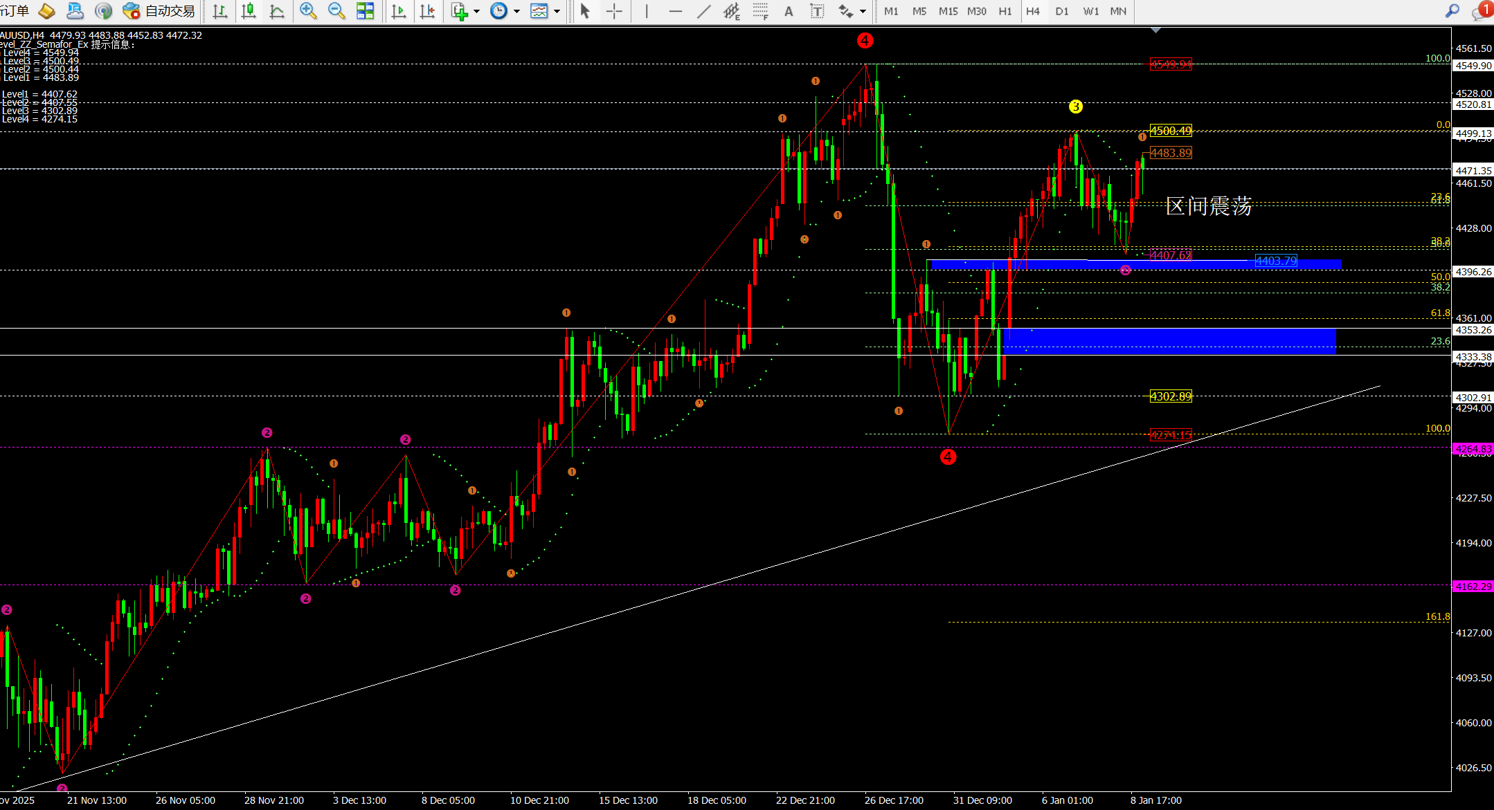 ① 日线昨日收线还是在4435-37上方,代表价格还是处于高位震荡走势。