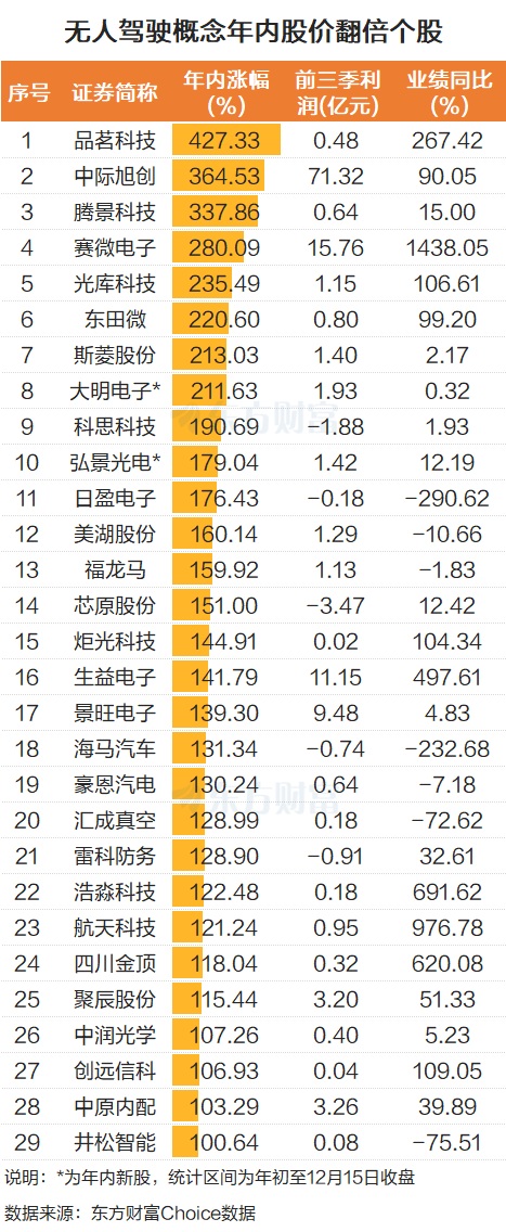 个股而言,品茗科技暂居无人驾驶概念“涨幅王”位置,年内累计上涨427.33%。该股前三季度归母净利润为0.48亿元,同比增长267.42%。
