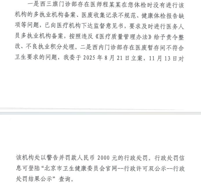 《意见书》显示,北京爱康国宾西三旗门诊部存在医师程某某在为张晓玲体检时没有进行该机构的多执业机构备案、医废收集记录不规范、健康体检报告缺项等问题,已向医疗机构下达监督意见书。北京爱康国宾西内门诊部存在医废暂存间不符合卫生要求的问题,对该机构处以警告并罚款人民币2000元的行政处罚。