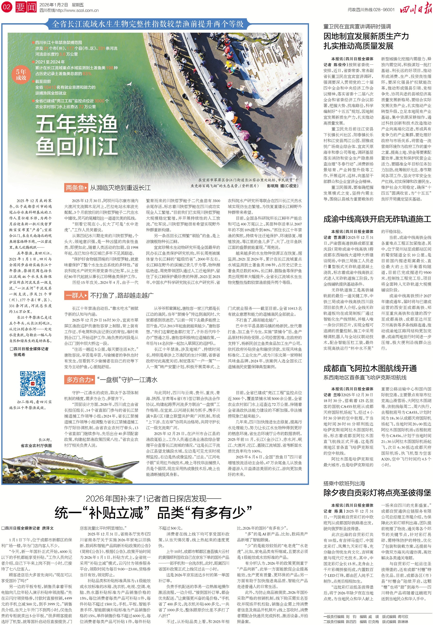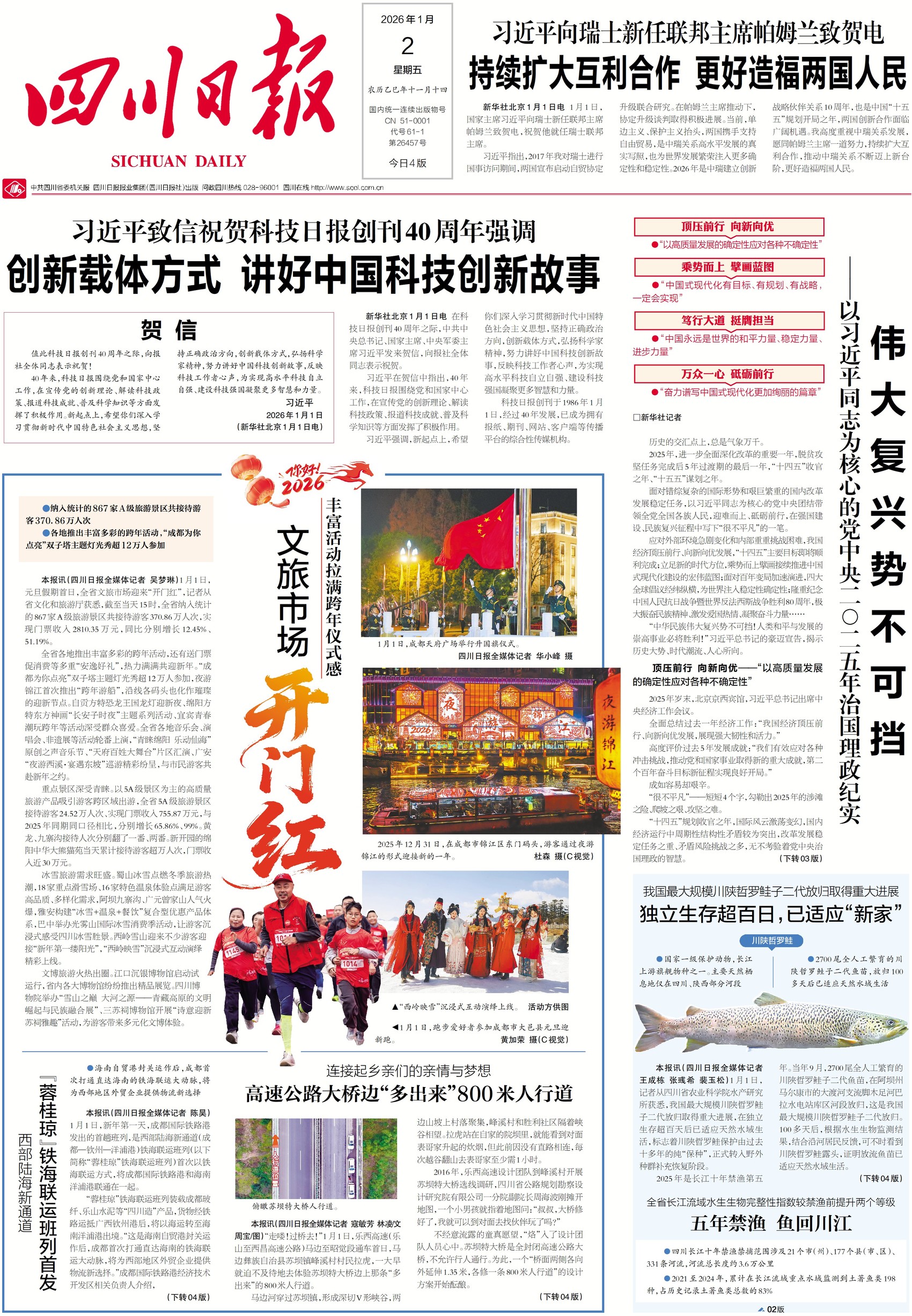 1月1日,元旦假期首日,巴蜀大地展现新气象。全省文旅市场迎来“开门红”,超370万人次走进省内各大景区,门票收入同比增长过半。乐西高速苏坝特大桥上一条专门为村民修建的人行道启用,让隔谷相望的邻里从原本 1小时的山路跋涉,变为10分钟就能串门。与此同时,西部陆海新通道“蓉桂琼”铁海联运班列首发启航,为“四川造”产品出海开辟了通往海南自贸港的新通道。详情关注今日一版。