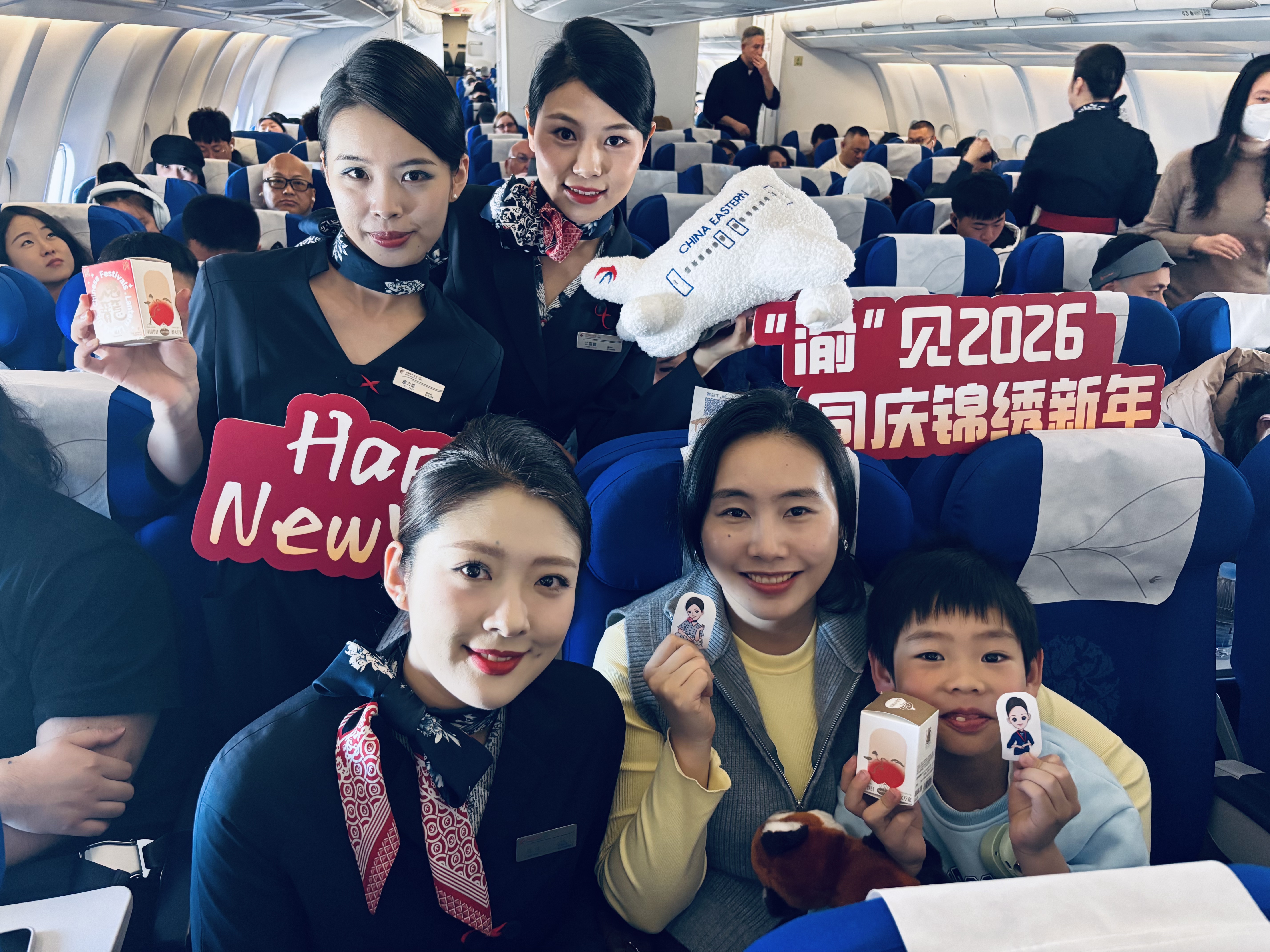 2026年1月1日,新年第一天,东航MU5429航班从上海虹桥机场腾空而起,飞往山城重庆。“新年快乐!欢迎搭乘‘渝见2026’元旦主题航班!”舱门口,乘务组用温暖的新年问候迎接旅客登机。