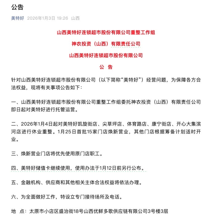 1月3日,美特好发布《山西美特好连锁超市股份有限公司重整工作组》《神农投资(山西)有限责任公司山西美特好连锁超市股份有限公司公告》,事关购物卡使用、员工权益、供货商款项、门店开业等核心问题。