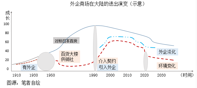 如笔者自绘图蓝色线所示,外企商场和传统商场行业大趋势基本一致:进入1990年代日本百货业出现峰值逐渐下滑时、我们迎来怠速换挡加速的井喷发展期,改开红利期直到2011年前后,多种因素托举,大型百货商场一路高歌,虽然2008年以后遇到同质化、预付卡、买单等诸多困难,但是总体依然光鲜。到了2012年后突然遭遇刹车,大势下跌,到2022年以后加大跌幅。