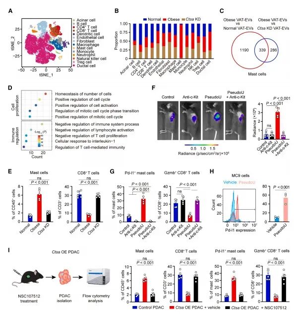 假尿苷的免疫调控作用具有细胞特异性。单细胞RNA测序揭示,接受肥胖VAT-EVs的小鼠肿瘤微环境中,肥大细胞比例激增,而CD8+ T细胞和自然杀伤细胞显著减少(图3B)。假尿苷通过肥大细胞特异性表达的核苷转运体SLC29A1进入胞内,引发ROS爆发,导致全局H3K27me3修饰水平下降。这种表观遗传重编程使肥大细胞增殖与免疫抑制相关基因(如Pd-l1、Xbp1、Snap23)启动子区染色质可及性增加93.2%,最终分化为高表达PD-L1的活化表型。功能实验确凿地证明:假尿苷单独处理即可重现肥胖VAT-EVs的促癌效应,该效应可被抗c-Kit抗体清除肥大细胞完全逆转(图3F);而CD8+ T细胞耗竭实验则显示,ASO-Ctsa、NSC107512或抗c-Kit的抑癌效果在T细胞缺失小鼠中完全消失,说明假尿苷激活的肥大细胞必须通过抑制CD8+ T细胞才能发挥促癌作用。