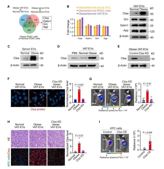 图2 肥胖内脏脂肪组织来源的细胞外囊泡含有促进小鼠KPC同种移植瘤生长的组织蛋白酶A(Ctsa)