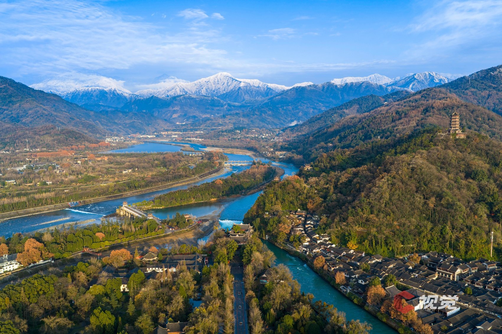 1月4日,都江堰天气晴朗,雪山映照下的都江堰水利工程熠熠生辉。C视觉签约摄影师 陈先林