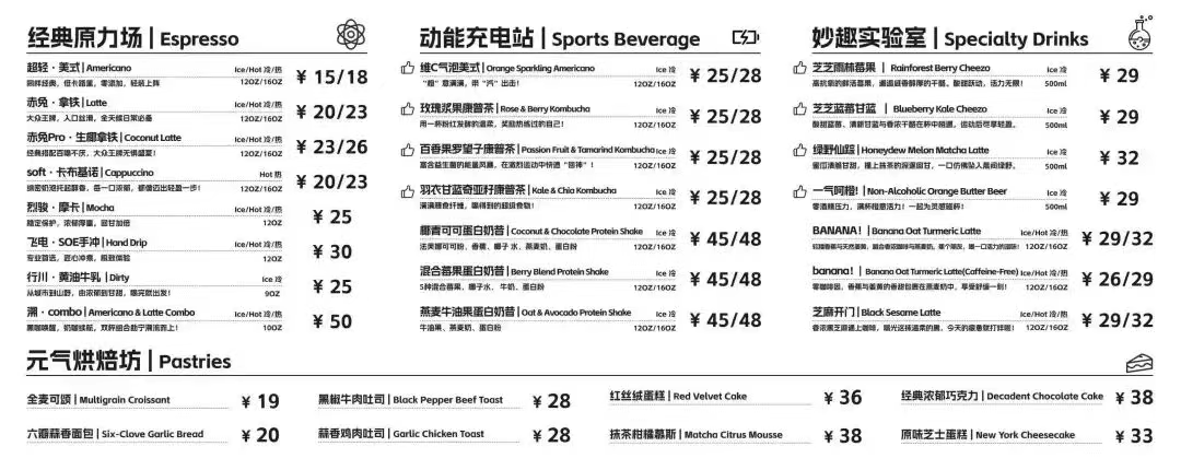公开菜单显示,其不仅有借用李宁经典跑鞋系列的“赤兔·拿铁”“烈骏·摩卡”等咖啡饮品,还有如羽衣甘蓝奇亚籽康普茶、混合梅果蛋白奶昔等紧扣运动场景与健身理念的健康饮;除此之外,店内还可提供全麦可颂、黑椒牛肉吐司、原味芝士蛋糕等烘焙产品。