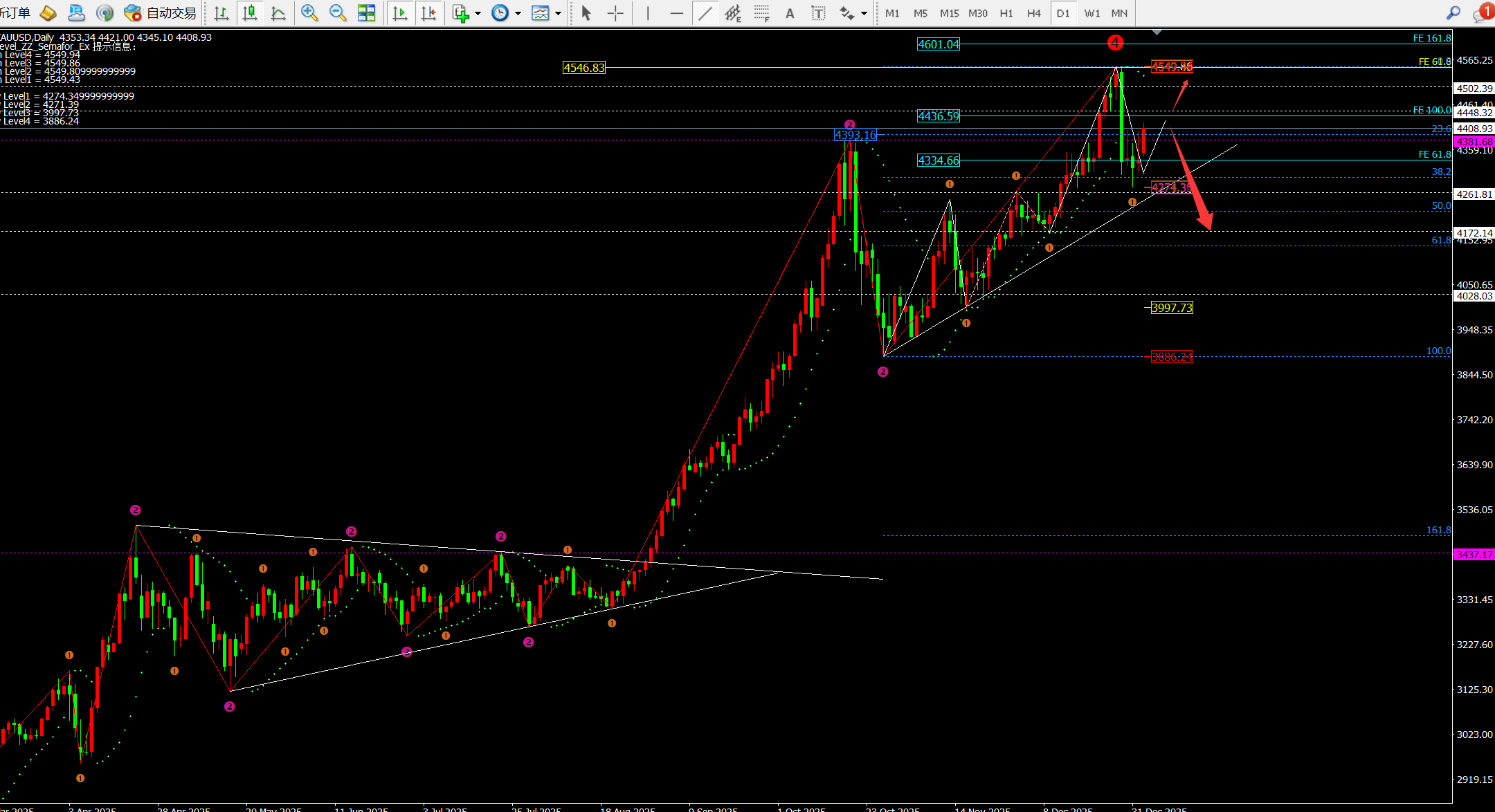不过周线和月线结合,下方关注点是4274-4250的支撑,破位就是4160附近。而高位压制就是4550一线。也就是目前大区间4550-4160,短期的小区间是4274-4550。