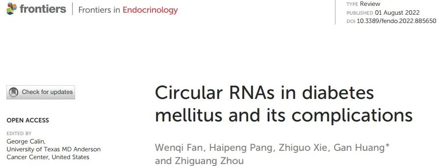 2022年8月,Frontiers in Endocrinology杂志发表了一篇题为“Circular RNAs in diabetes mellitus and its complications”的综述文章[1],系统总结了环形RNA在糖尿病及其并发症中的研究进展,揭示了其作为潜在生物标志物和治疗靶点的巨大潜力。然而,目前的研究仍处于初级阶段,许多问题亟待解决,例如环形RNA的具体作用机制、临床应用的可行性等。本文的亮点在于全面梳理了环形RNA在糖尿病领域的研究现状,为未来的研究方向提供了清晰的指引,尤其是在探索新的治疗靶点方面,为糖尿病的精准治疗带来了新的希望。