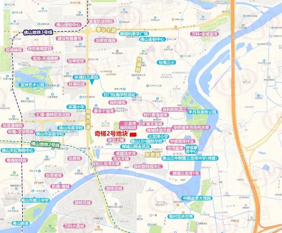 从区位上看,地块位处禅城、南海交界地段,西侧为著名的商贸长廊桂澜路,建成了佛山金铂中心、南海万科广场等购物中心;北侧为华祥路,可直通半月岛湿地公园。