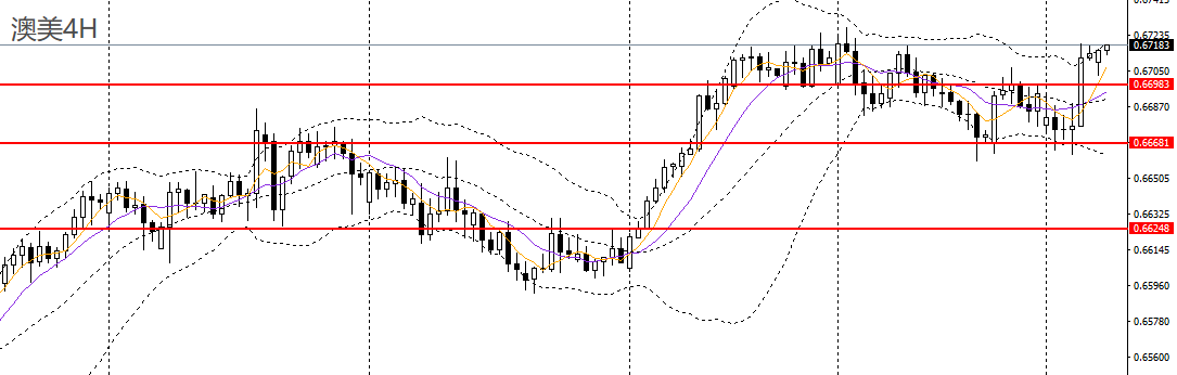 澳美昨日延续上行,升破5日均线,4小时彻底升破0.67关口压力,呈双底,0.67附近企稳可进多,如升破前高,可继续上看至0.6740。