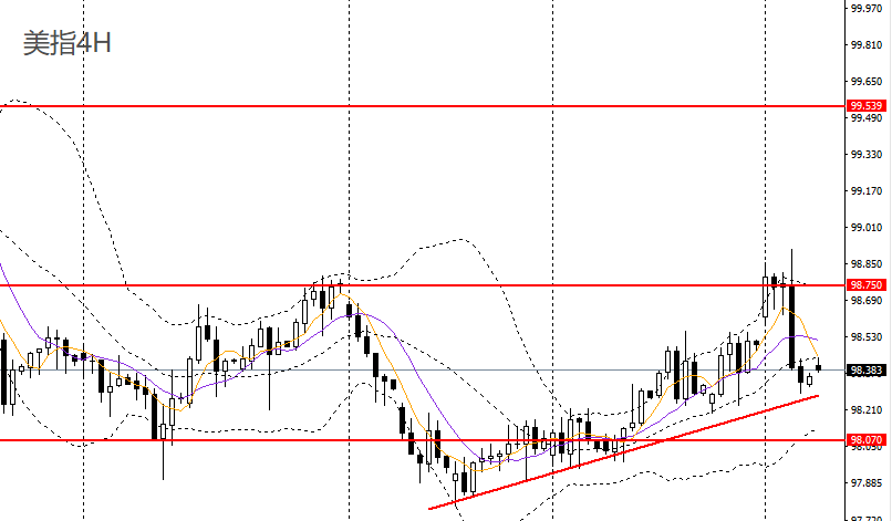美元指数昨日收流星阴线,徘徊于5日、10日均线附近,4小时未能升破99关口,再度承压于98.50下方,短线大概率将延续震荡。